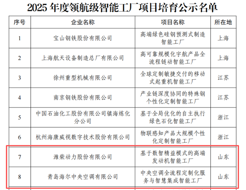 近日,工信部公示了2025年度领航级智能工厂项目培育名单,全国有15家企业入选,我省潍柴动力和青岛海尔2家企业入围,数量并列全国第一。