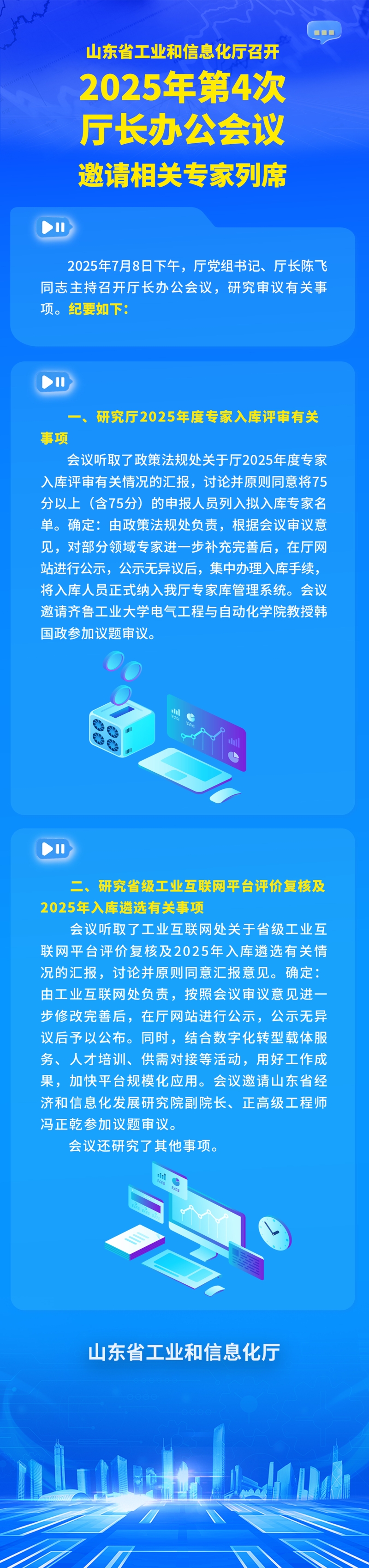 会议听取了工业互联网处关于省级工业互联网平台评价复核及2025年入库遴选有关情况的汇报,讨论并原则同意汇报意见。确定:由工业互联网处负责,按照会议审议意见进一步修改完善后,在厅网站进行公示,公示无异议后予以公布。同时,结合数字化转型载体服务、人才培训、供需对接等活动,用好工作成果,加快平台规模化应用。会议邀请⼭东省经济和信息化发展研究院副院长、正高级工程师冯正乾参加议题审议。