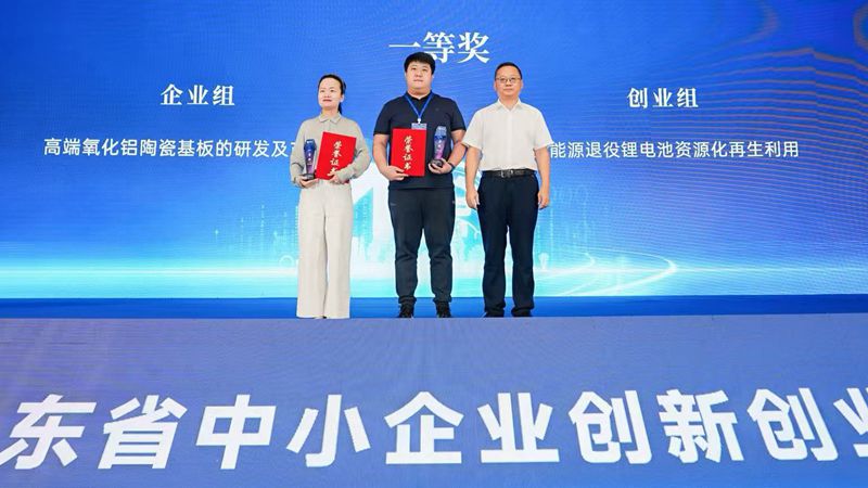 经过初赛、复赛、决赛的层层选拔,50个优秀项目脱颖而出,其中,菏泽市“高端氧化铝陶瓷基板的研发及产业化”项目、泰安市“新能源退役锂电池资源化再生利用”项目分别荣获企业组、创业组一等奖。